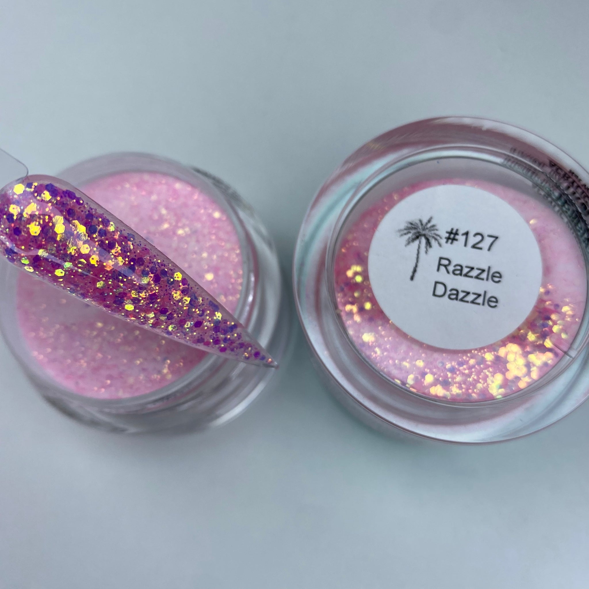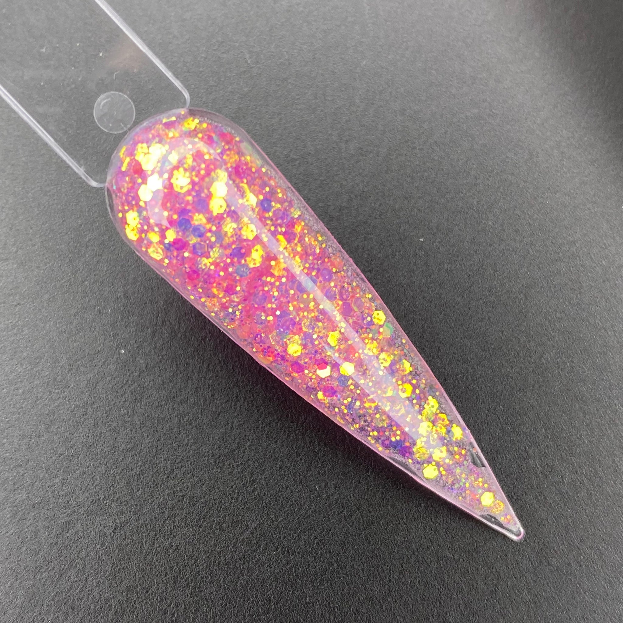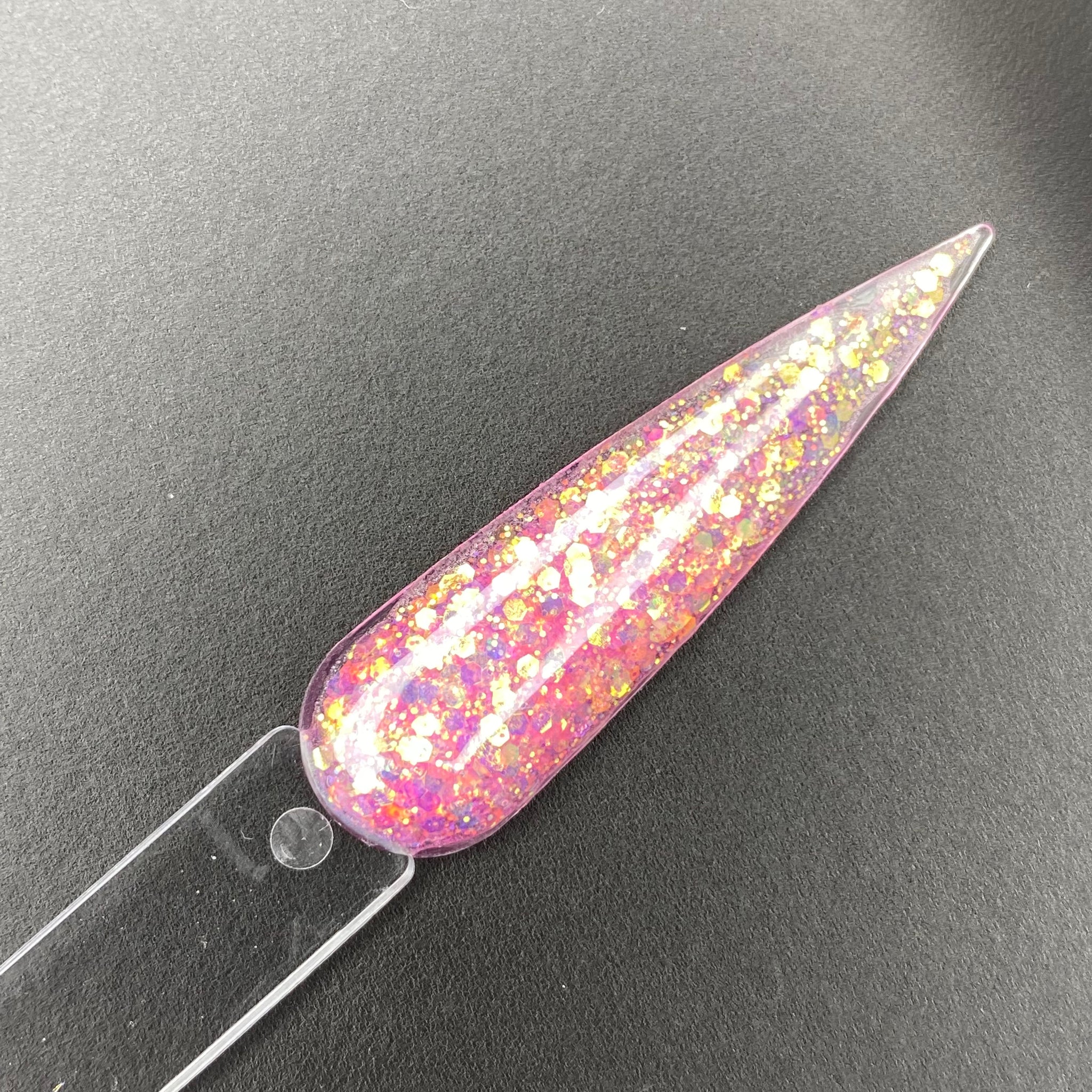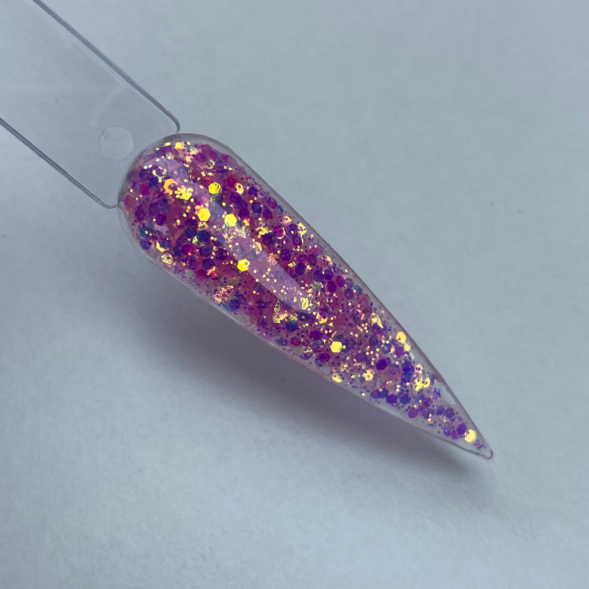 Our “Razzle Dazzle” Glitter acrylic is a beautiful pink color glitter acrylic with hints of purple and gold glitter inside.