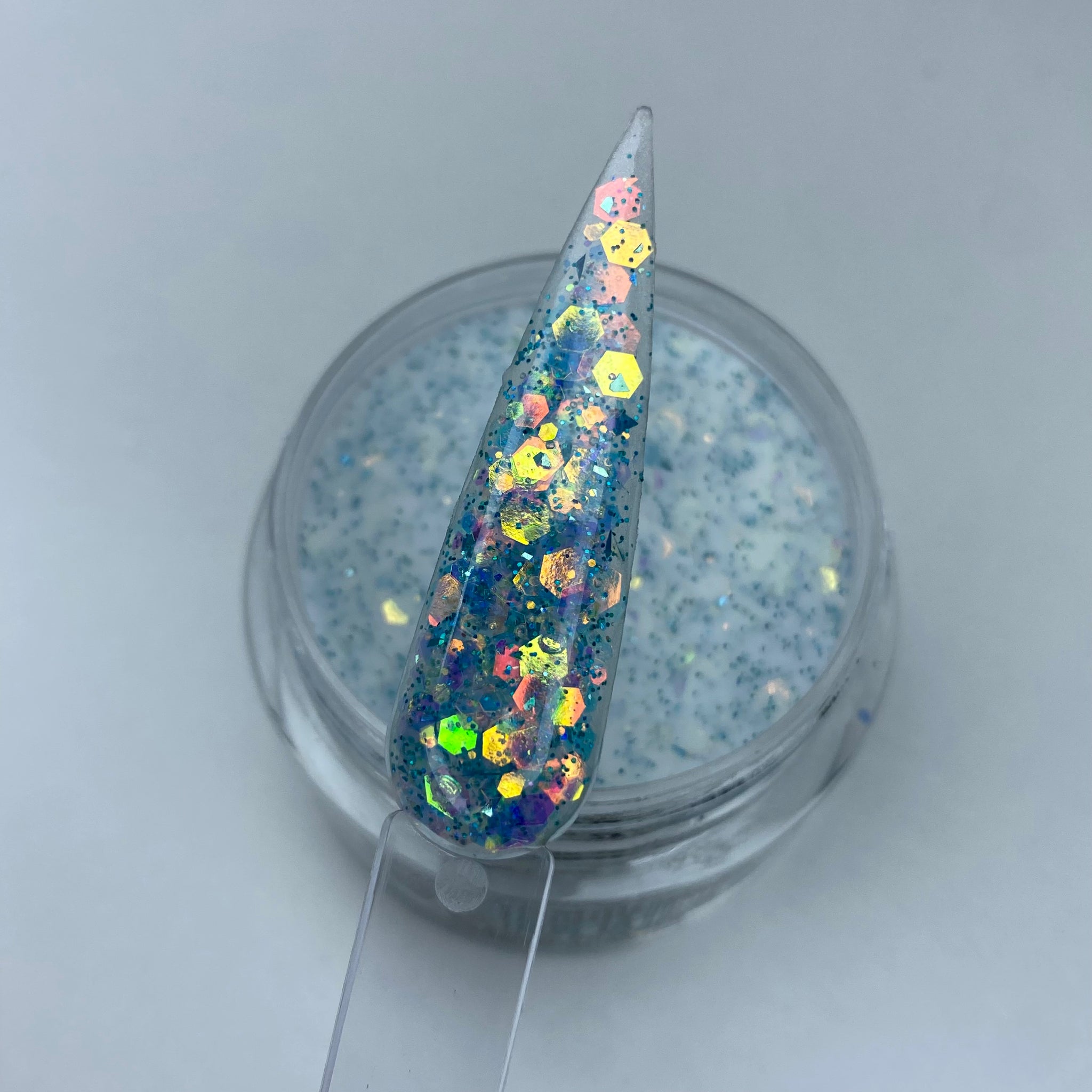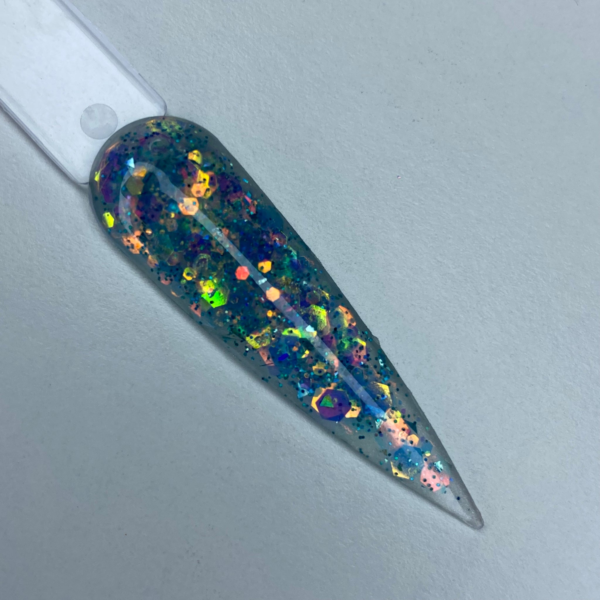 Our “Jungle Blue” Glitter acrylic is a teal blue fine glitter acrylics with chunky reflective flakes of glitter inside.