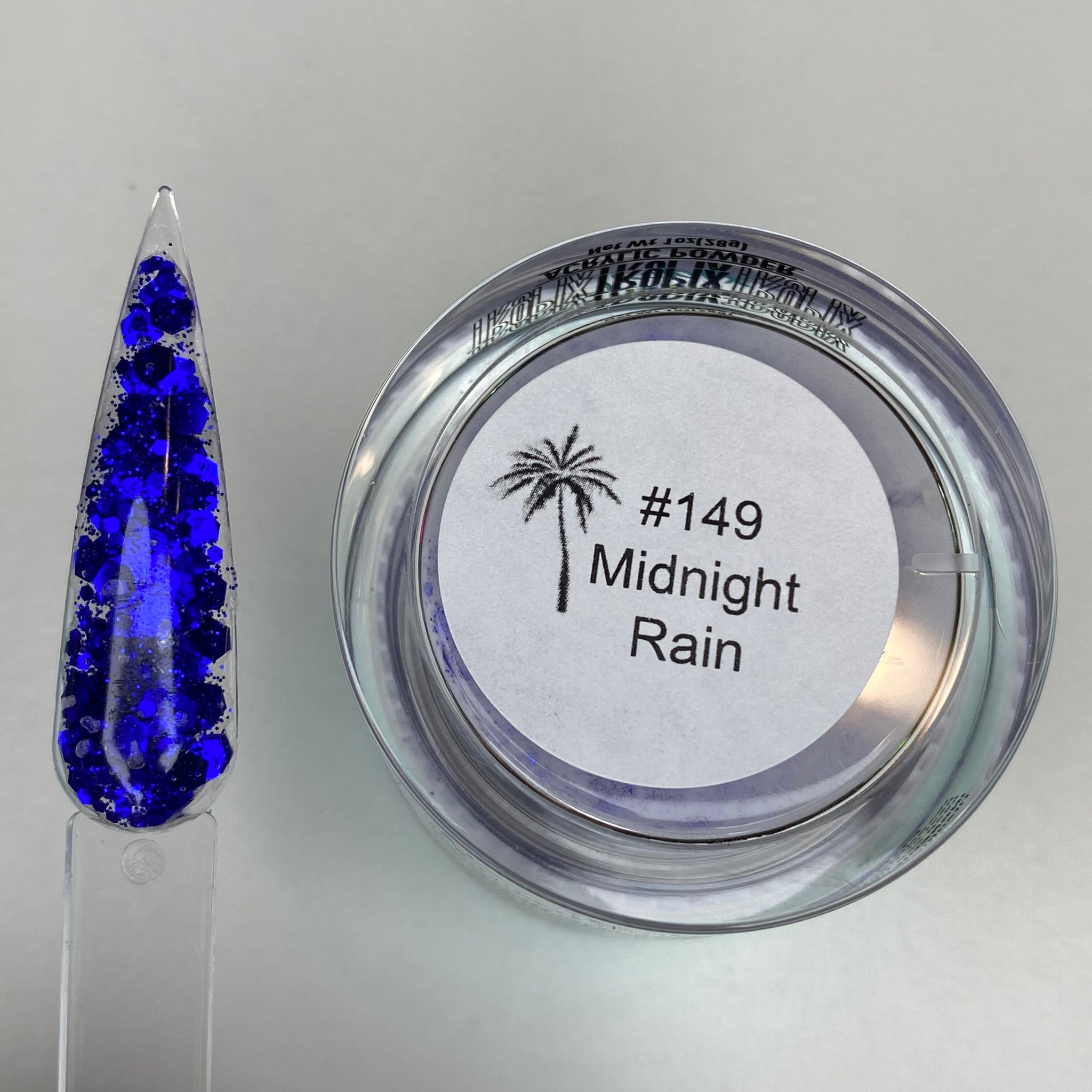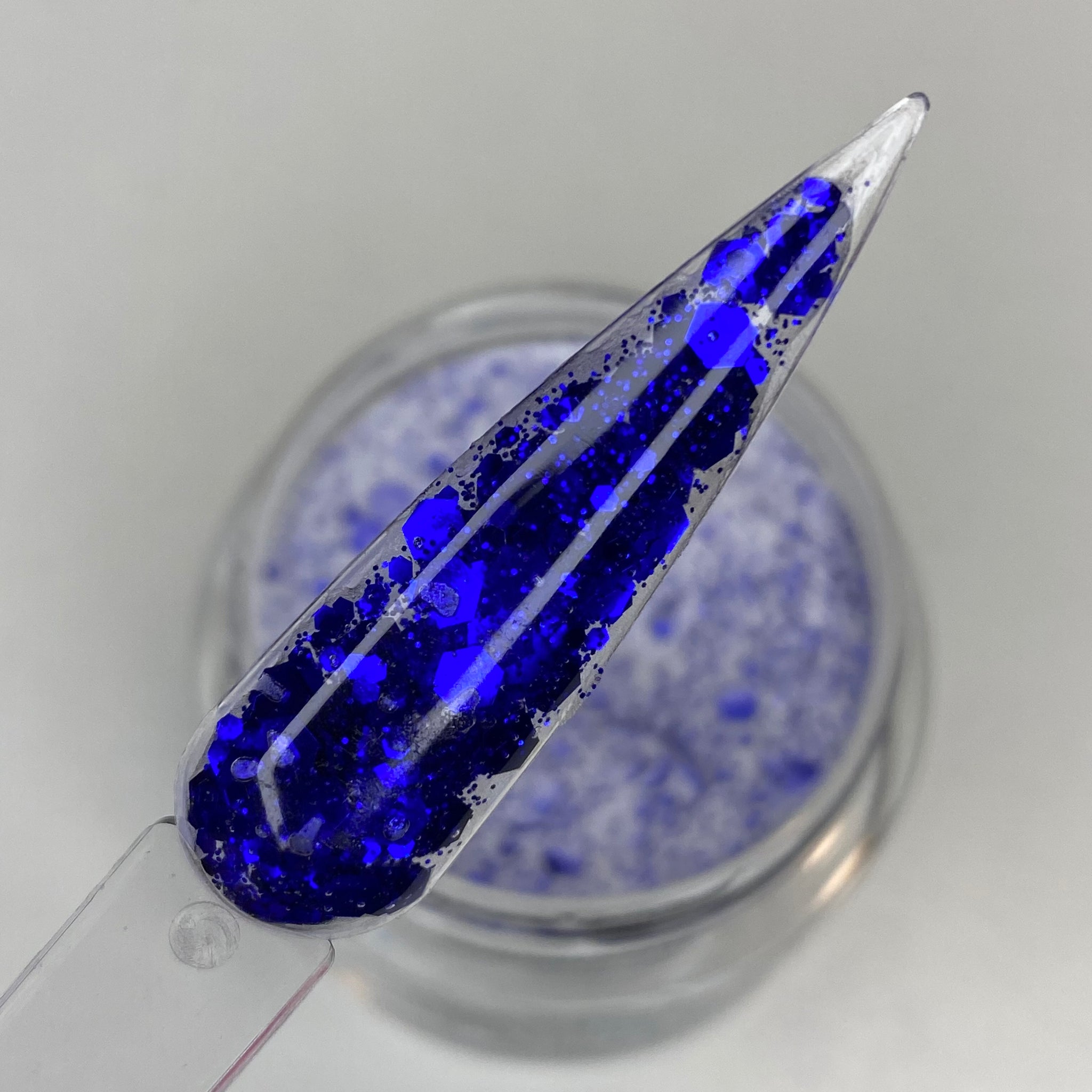 Our “Midnight Rain” Glitter acrylic is a Royal blue chunky glitter in clear acrylic powder.