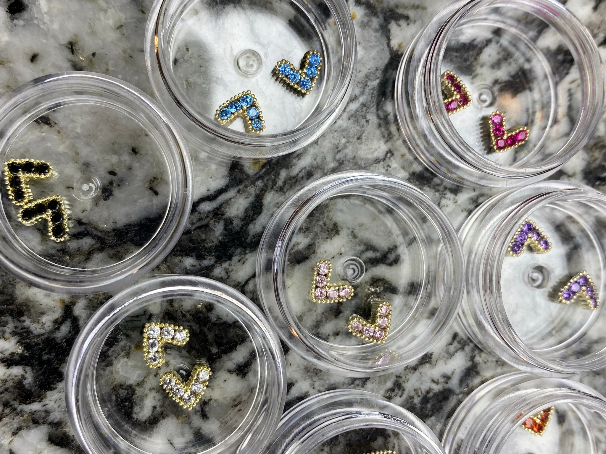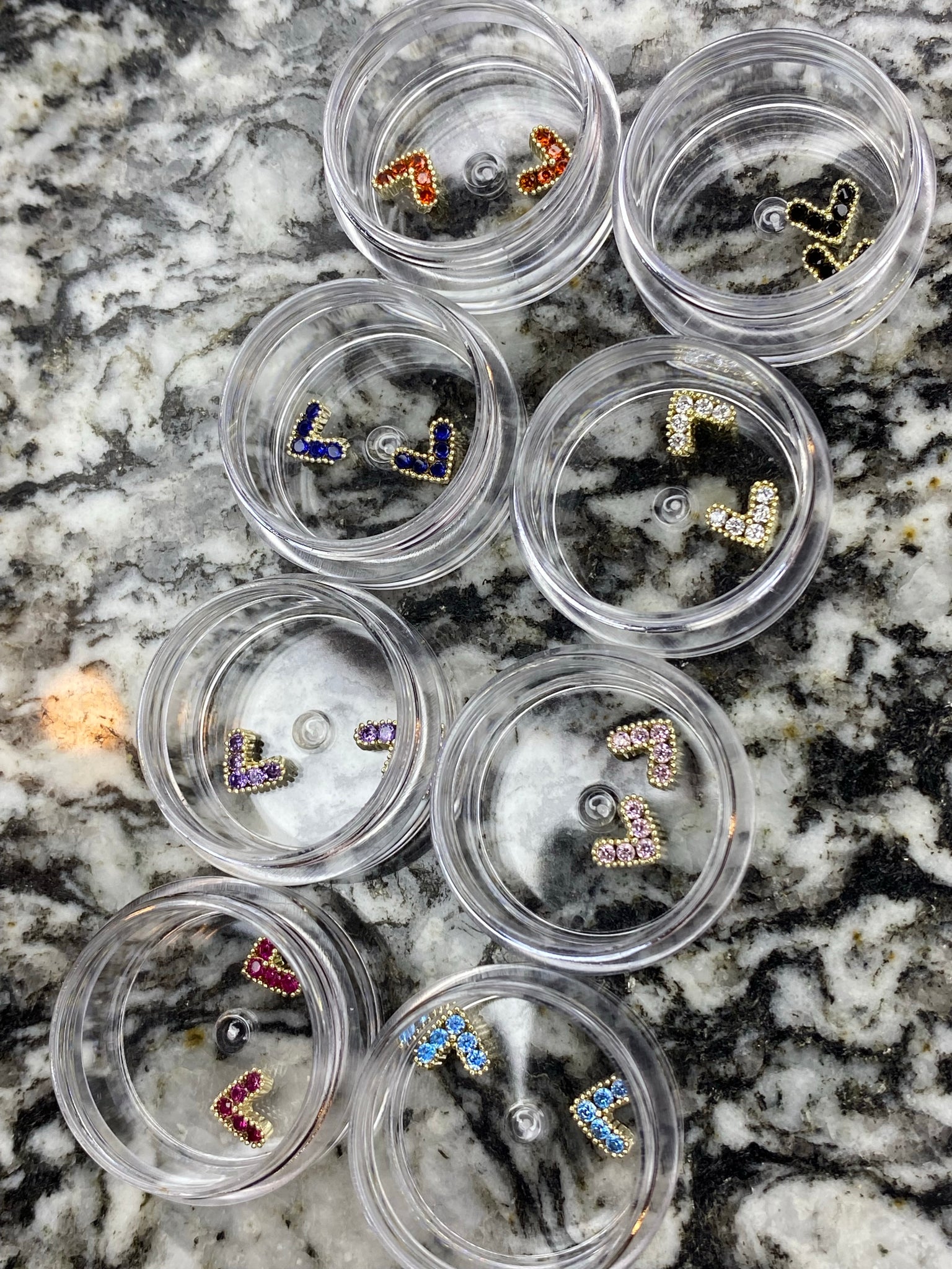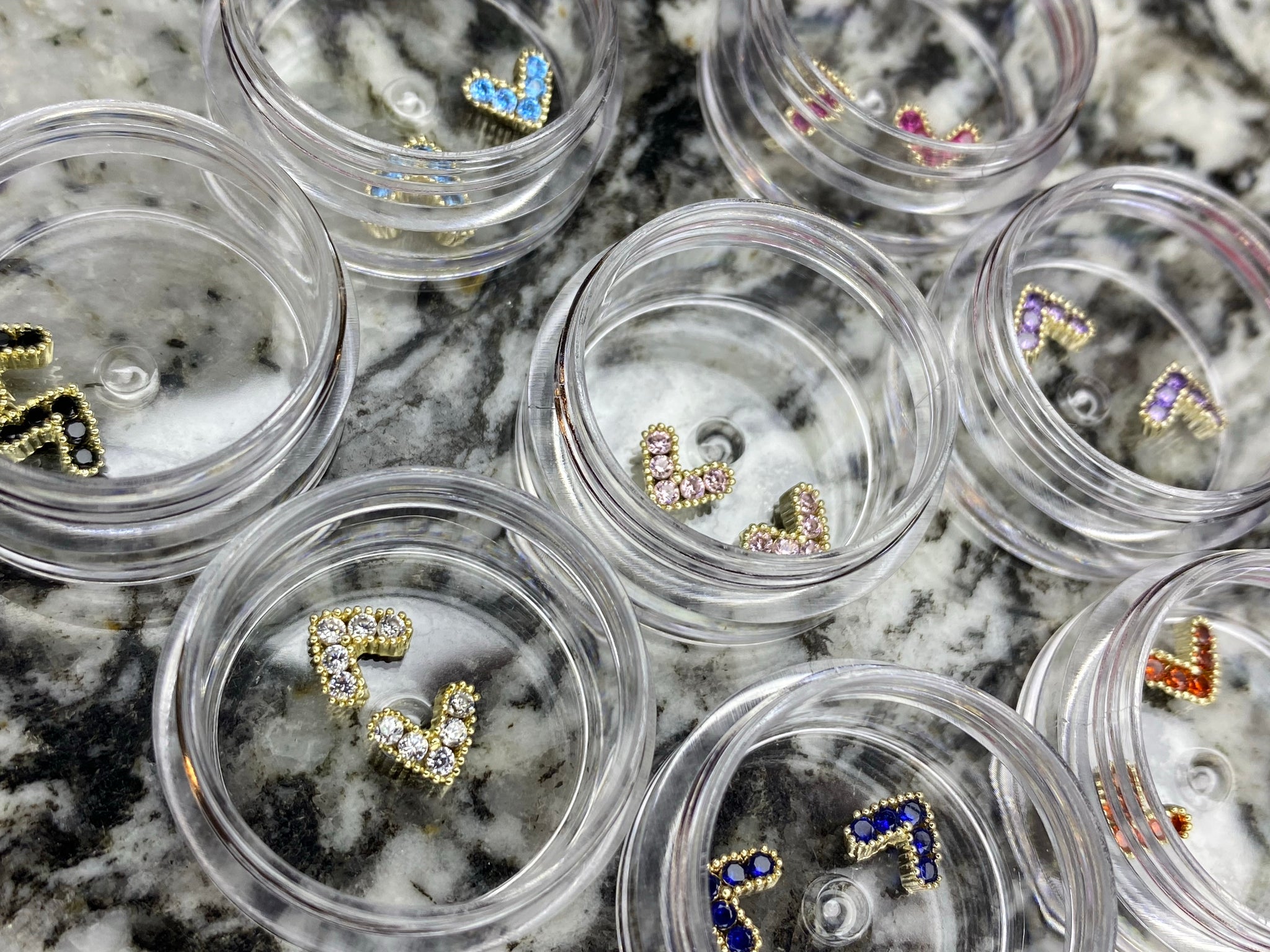 Our “V-Heart Nail Charms” come in 8 color options